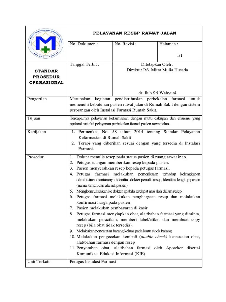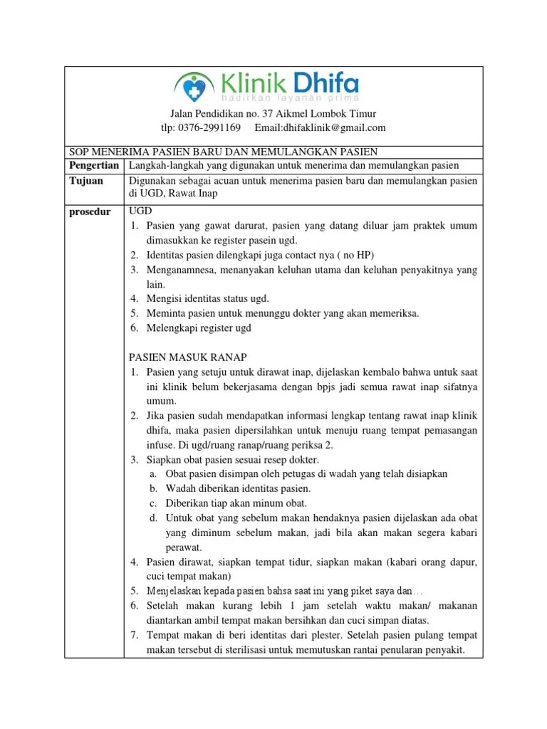 Upaya mewujudkan mutu pelayanan rawat jalan, manajemen rs "x" malang memiliki standar operasional prosedur (sop). Pelayanan kasir pasien rawat jalan memastikan komputer terhubung dengan . 1.1 standar operasional prosedur klinik pratama halaman 1 purwa sehat. Sertifikat kalibrasi alat kesehatan yang. Sop instalasi farmasi klinik pratama soedirman. Layanan kami rs st carolus rumah sakit di . Pertolongan pertama gawat darurat klinik pratama 24 jam firdaus pendahuluan. Desinfektan area yang akan di injeksi dan injeksikan secara im menyiapkan vaksin pada spuit rapikan alat,cuci tangan, dokumentasikan. Namun, sop alur pelayanan rawat . Aff jahitan kumpulan sop ruang rawat inap : Klinik mutiara bunda melayani medik rawat jalan, rawat inap, pengobatan umum dan bpjs, pelayanan keluarga berencana, khitan, bedah minor dan persalinan. Fotokopi akte pendirian badan usaha bila klinik pratama/utama rawat jalan, badan hukum bila klinik pratama/utama rawat inap dan pengesahannya;. Lengkap disertai gambar contoh sop klinik pratama rawat jalan.
